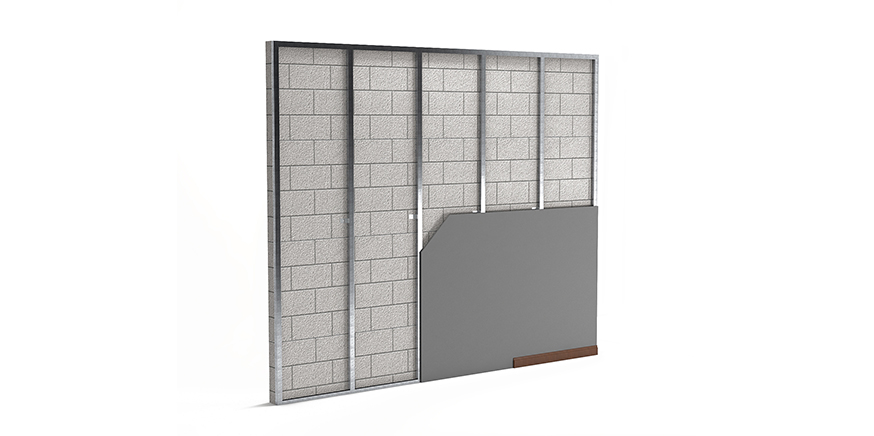 Where the existing substrate is not suitable for a directly bonded solution, a frame is required to support the lining. This liner system braces to the background to allow for minimal width build ups and allows for acoustic upgrades to the existing wall.